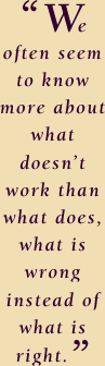 | Prior to the terrorist attacks upon our nation and the revelation of broad corporate malfeasance, my research showed that at least 50 percent of the American work force was either working wounded, cynical, or indifferent. This also includes many professionals whose job it is to do something about it. Now, everyone who goes to work each day faces the new challenges of living with an unrelenting fear about what might happen next. Horrifying images forever seared into our memory will always remind of us of that fateful, clear September morning when all hell broke loose. Our feeling of security plummeted even more when we learned that corporate executives were making out like bandits while our life savings dwindled to nothing. With no history to guide us and no role models to show us the way, we need each other in ways never known before. | |||||||||||||||||||||||||||||||||||||